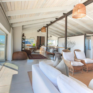 Ascend a second flight of stairs and prepare to have your breath taken away by the most magnificent view from the living areas. The open space allows for maximum light and the stacking doors fold back onto balconies to reveal a 180 deg panoramic view of the beach and Chapmans peak. Wherever you stand – inside or out, there are just beautiful views of either mountain or sea/beach.